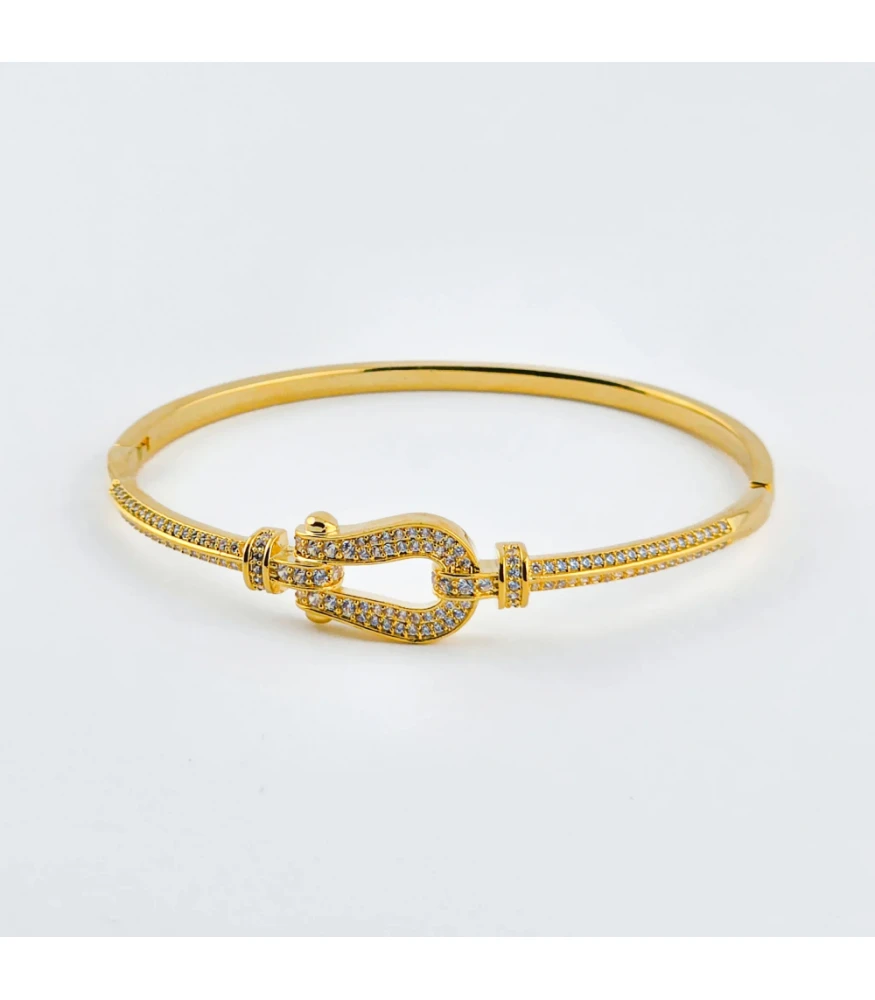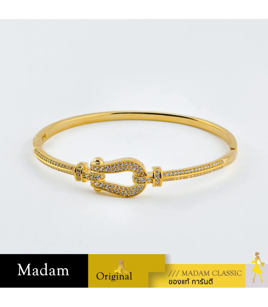 กำไลข้อมือชิ้นนี้เป็นตัวอย่างของความหรูหราที่มาพร้อมกับดีไซน์อันเป็นเอกลักษณ์ ตัวเรือนสีทองอร่ามเปล่งประกาย สะท้อนความมั่งคั่งและความสง่างามคลาสสิก