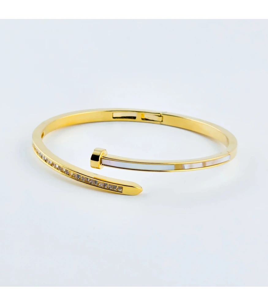 การออกแบบที่ได้รับแรงบันดาลใจจากตะปู มาปรับโฉมให้มีความเรียบหรูและทันสมัยยิ่งขึ้น ด้วยเส้นสายที่สะอาดตาและการผสมผสานวัสดุที่แตกต่างกันอย่างลงตัว ด้านหนึ่งของกำไลถูกตกแต่งด้วยแผ่นสีขาวมุกหรือเปลือกหอยมุก (Mother of Pearl) ที่เรียบเนียนและเงางาม อีกด้านหนึ่งถูกประดับด้วยเพชรทรงบาแกตต์ (Baguette Cut) ที่เรียงรายกันอย่างเป็นระเบียบ ทำให้เกิดประกายแสงที่คมชัดและทันสมัย