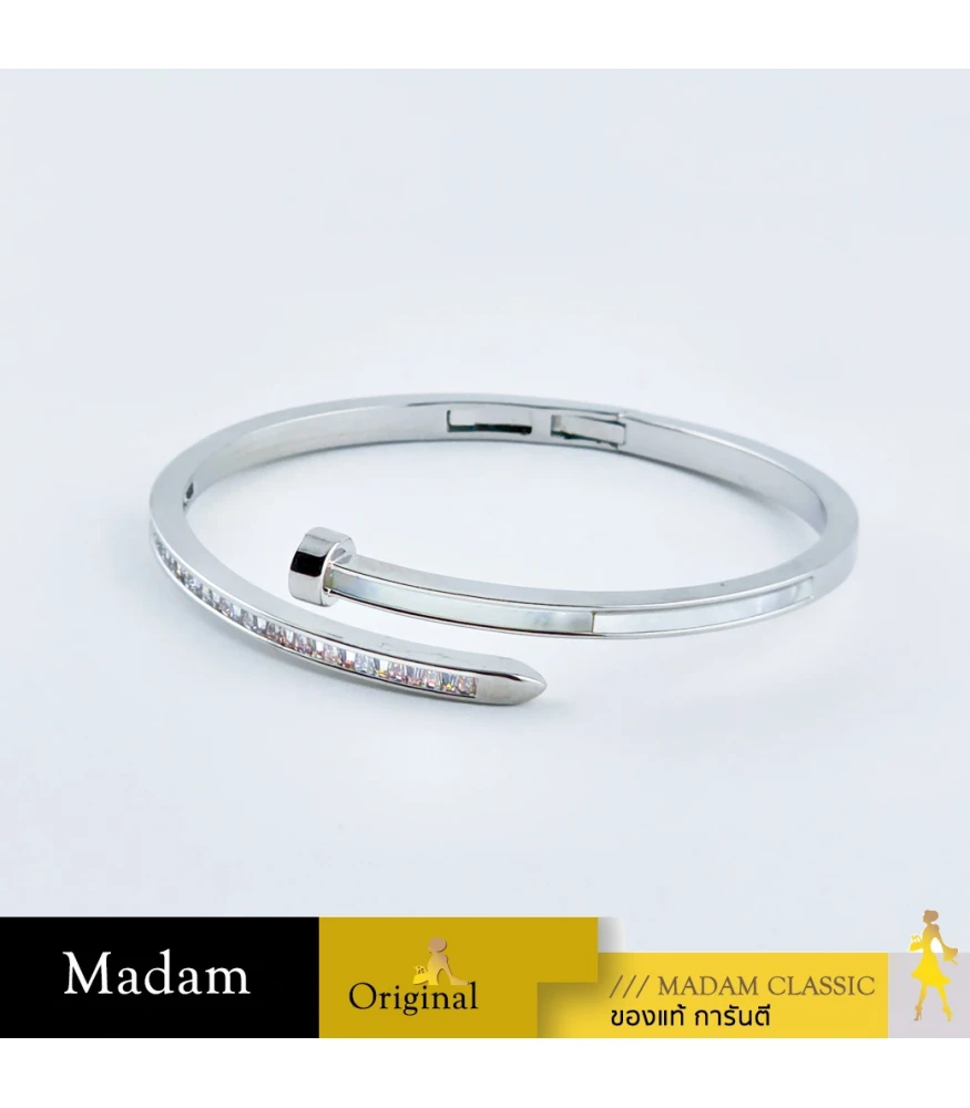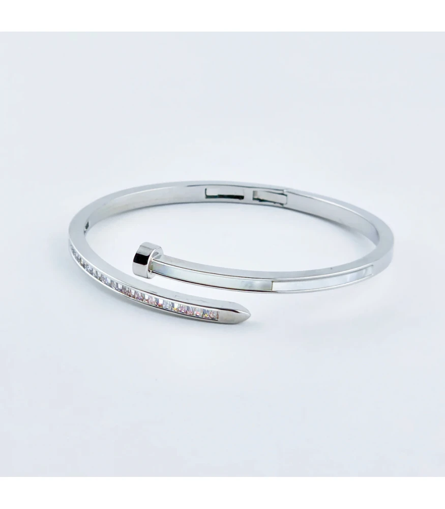 การออกแบบที่ได้รับแรงบันดาลใจจากตะปู มาปรับโฉมให้มีความเรียบหรูและทันสมัยยิ่งขึ้น ด้วยเส้นสายที่สะอาดตาและการผสมผสานวัสดุที่แตกต่างกันอย่างลงตัว ด้านหนึ่งของกำไลถูกตกแต่งด้วยแผ่นสีขาวมุกหรือเปลือกหอยมุก (Mother of Pearl) ที่เรียบเนียนและเงางาม อีกด้านหนึ่งถูกประดับด้วยเพชรทรงบาแกตต์ (Baguette Cut) ที่เรียงรายกันอย่างเป็นระเบียบ ทำให้เกิดประกายแสงที่คมชัดและทันสมัย