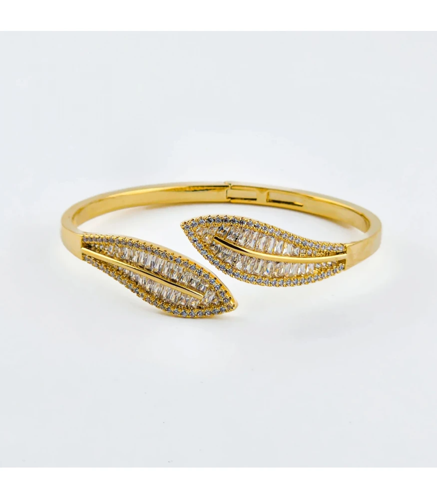 กำไลข้อมือชิ้นนี้สะท้อนความงดงามของธรรมชาติได้อย่างอ่อนช้อยและหรูหรา ด้วยดีไซน์ที่ได้รับแรงบันดาลใจจากรูปทรงของใบไม้ จุดเด่นของกำไลอยู่ที่ปลายทั้งสองด้าน ซึ่งถูกออกแบบให้เป็นรูปทรงคล้ายใบไม้ที่โค้งมนอย่างเป็นธรรมชาติ ให้ความรู้สึกเรียบหรูและทันสมัย