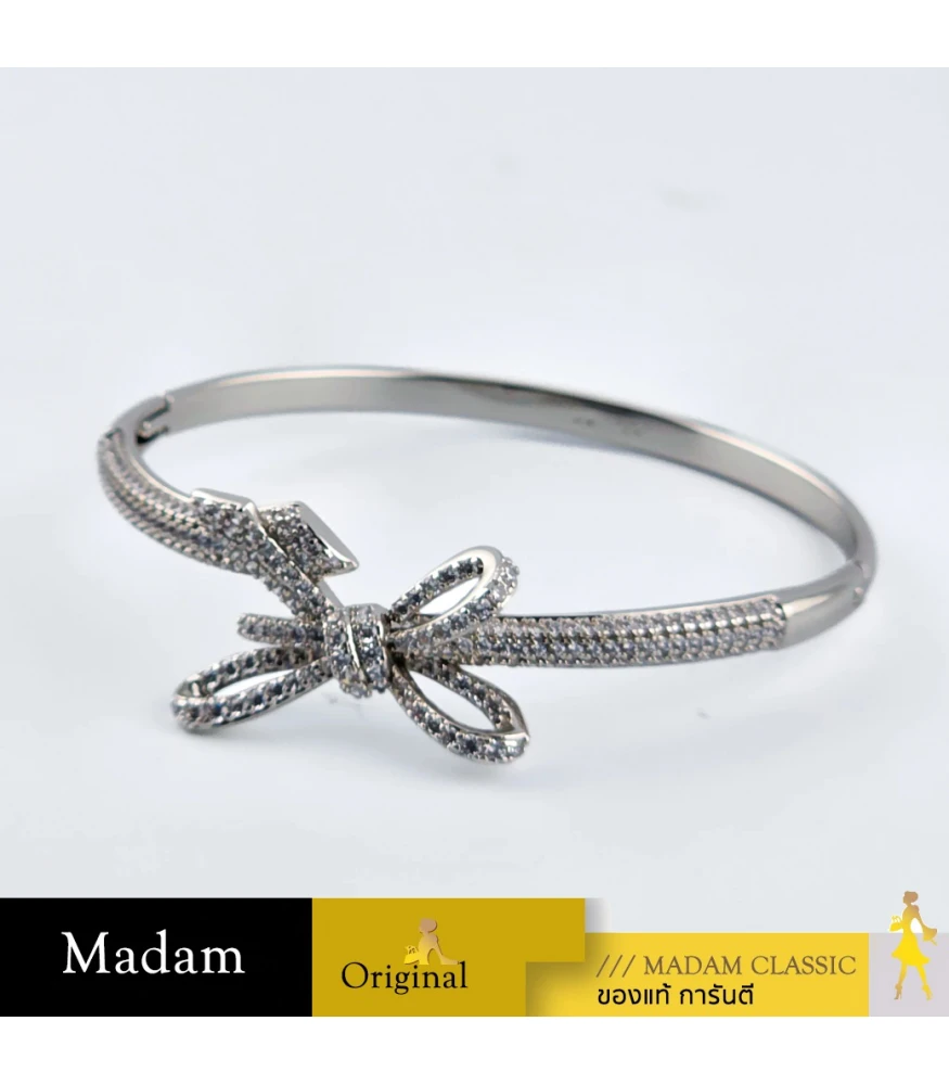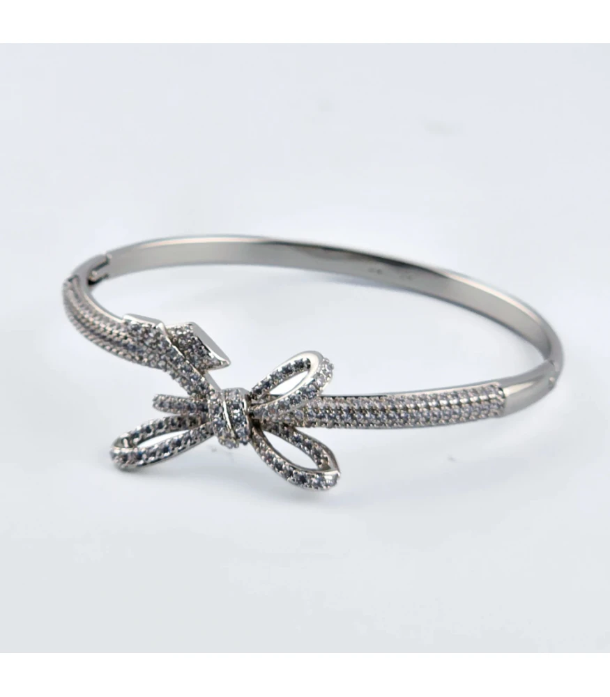 กำไลข้อมือชิ้นนี้เป็นตัวแทนของความอ่อนหวานและความหรูหราที่ละเอียดอ่อน ด้วยดีไซน์รูปโบว์ที่น่ารักและสง่างาม ตัวเรือนสีเงินเงางาม ให้ความรู้สึกทันสมัยและบริสุทธิ์