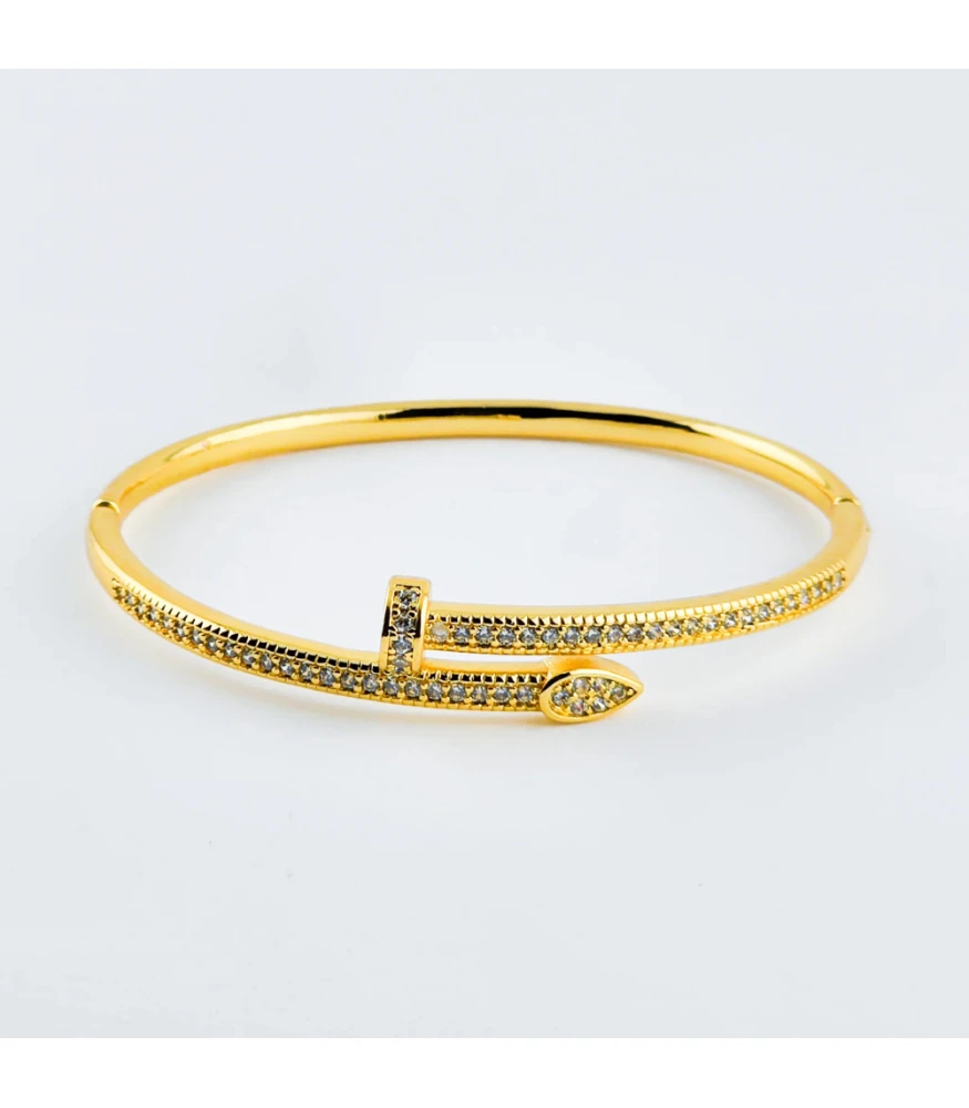 กำไลชิ้นนี้พิเศษคือการประดับด้วยเพชรหรือคริสตัลเม็ดเล็กๆทั่วพื้นผิวของ ""ตะปู"" ไม่ว่าจะเป็นบริเวณส่วนของตัวกำไลที่โค้งมน หัวตะปู หรือปลายตะปู ทุกอณูถูกรังสรรค์ด้วยประกายแสง ทำให้กำไลดูเจิดจรัสและดึงดูดสายตา